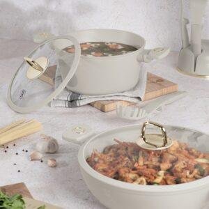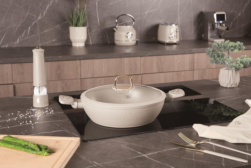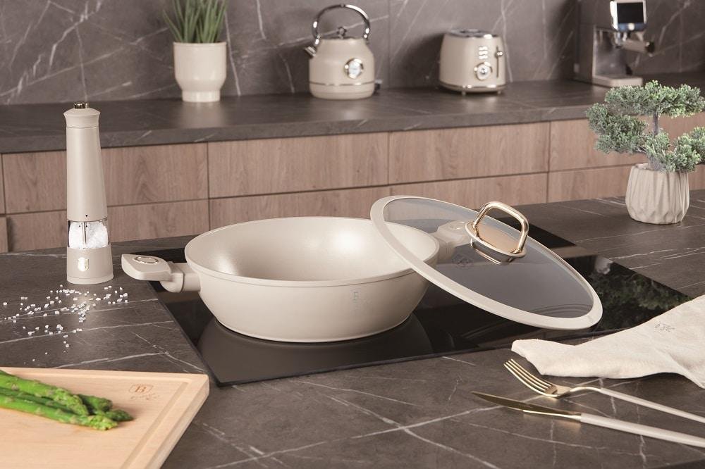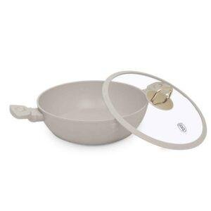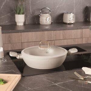 🍲 Совршена комбинација од модерна естетика и функционалност! Овој плиток тенџере со капак е изработен од кован алуминиум со трослојна TitanPro нелеплива обвивка за рамномерна и ефективна подготовка. Погоден за пржење, варење и подготвување разни јадења кај кои е потребна лесна контрола на температурата и брзо чистење.
